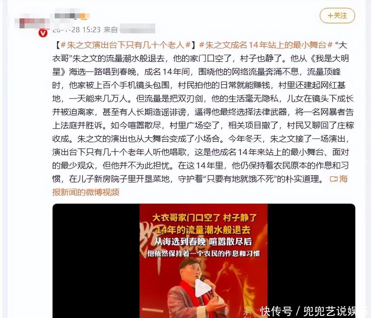 参考链接极目新闻报道,“大衣哥”朱之文:走红已有15个年头,我依然是那个爱唱歌的农民 2026.1.28