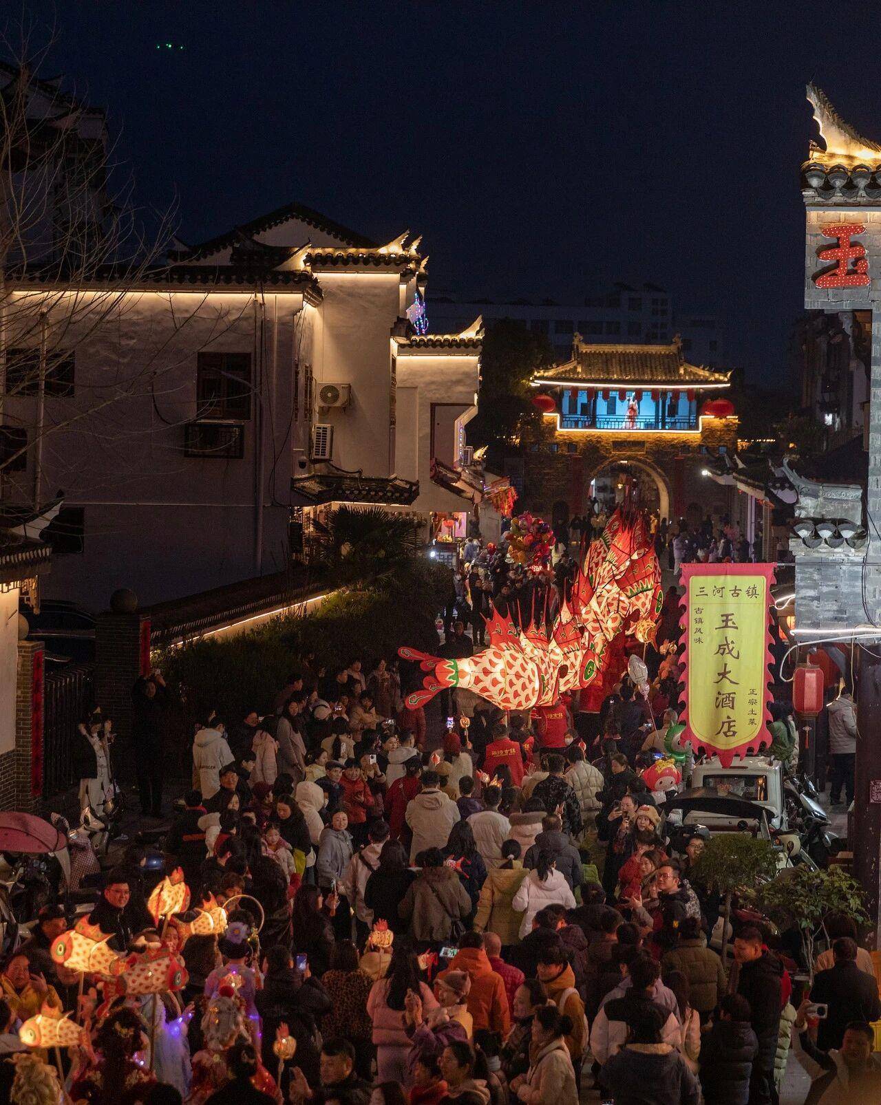 r每天18时到21时,数百人甚至上千人的鱼灯巡游队伍会从三河古镇的万年台景点一起出发,经过古城墙、鑫樾阁、三县桥等核心景点,舞动着手工扎制的传统徽州鱼灯,穿行在古镇的街巷里。