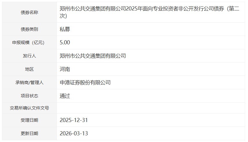 【大河财立方消息】3月13日实盘配资,郑州市公共交通集团有限公司2025年面向专业投资者非公开发行公司债券(第二次)项目获深交所通过。债券申报规模5亿元,承销商/管理人为申港证券。2026年1月19日,经大公国际综合评定,发行人主体信用评级为AA+,展望稳定。