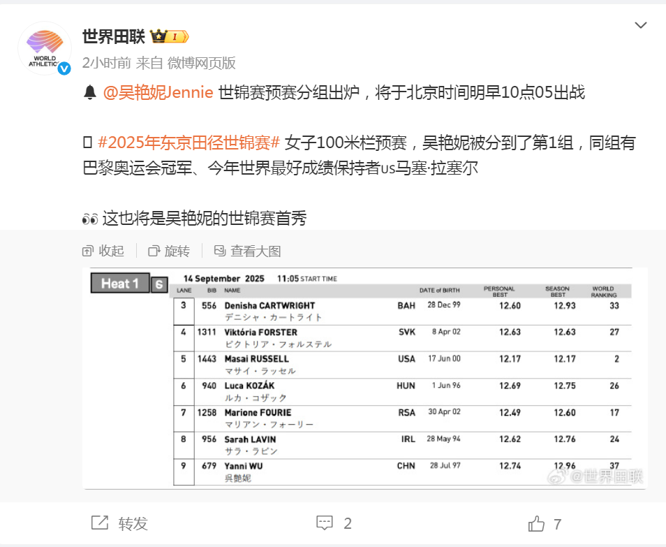2025东京田径世锦赛女子100米栏预赛分组已公布。中国选手吴艳妮被分在第一组第9道,同组有巴黎奥运会冠军、今年世界最好成绩保持者马塞·拉塞尔。吴艳妮将于北京时间9月14日10时05分出战。