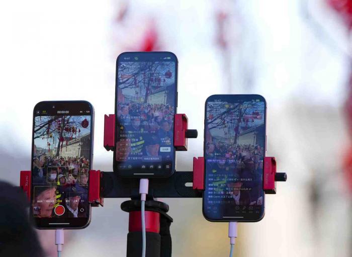 现场的游客打卡、直播。