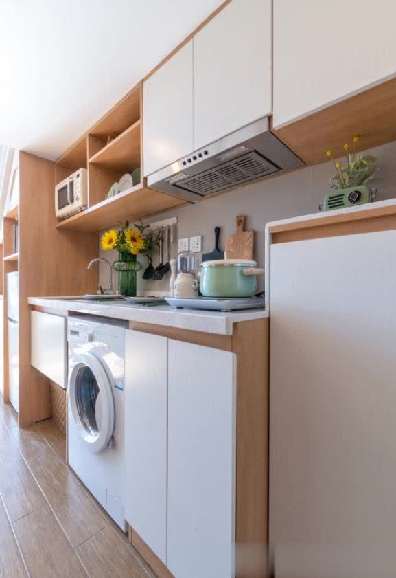 ▲过道开放区域兼顾小厨房,还能布局洗烘机,一个人住偶尔做简单烹饪是必要的;上头超薄吊柜满足收纳配资平台股票行情,避免进门口视觉拥挤。
