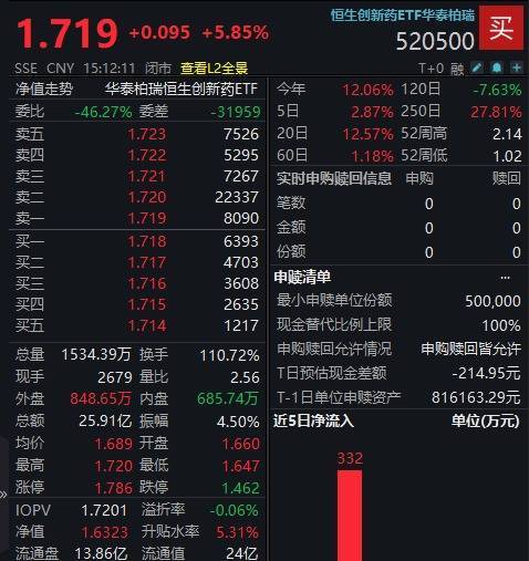 医药相关ETF集体大涨,恒生创新药ETF华泰柏瑞(520500)大涨5.85%,科创创新药ETF国泰(589720)上涨3.86%。